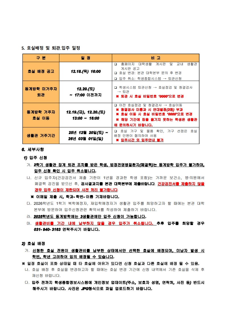 2025학년도 동계방학 호실 배정 공고안내(12.18)