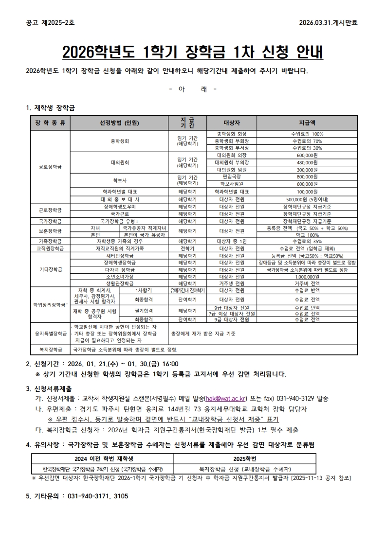 2026학년도 1학기 장학금 신청 안내