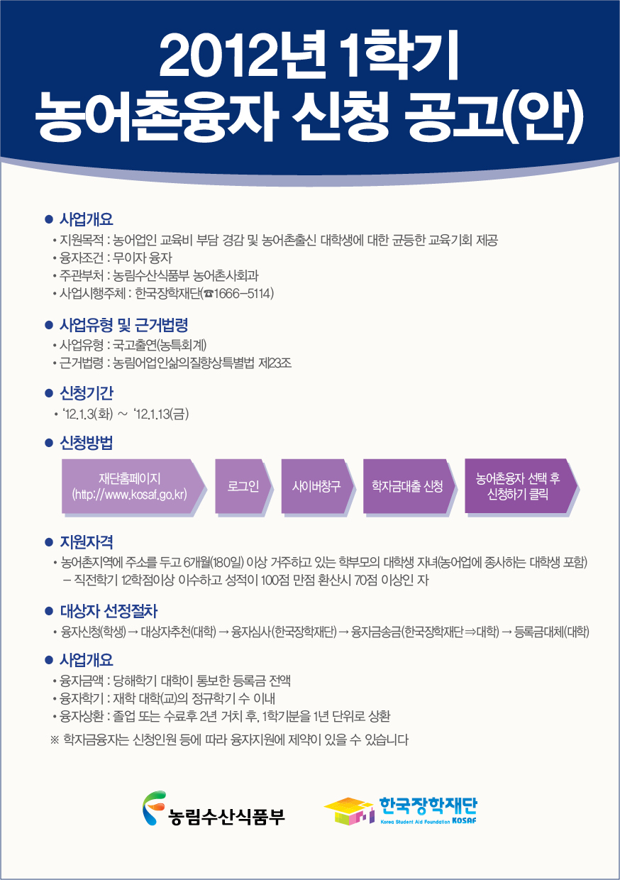 2012-1학기 농어촌 학자금 융자 신청 안내