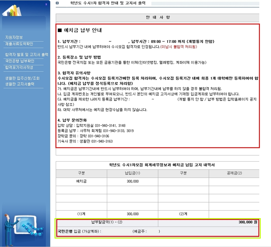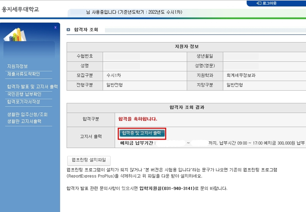 3. 왼편 메뉴 중 [합격자 발표 및 고지서 출력] 메뉴 선택, 클릭