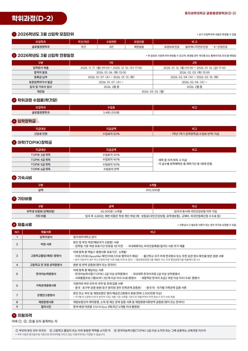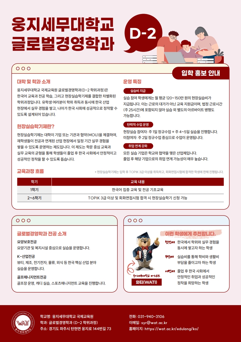 웅지세무대학교 글로벌경영학과(순수 외국인 전담 학과) 신입생 모집안내