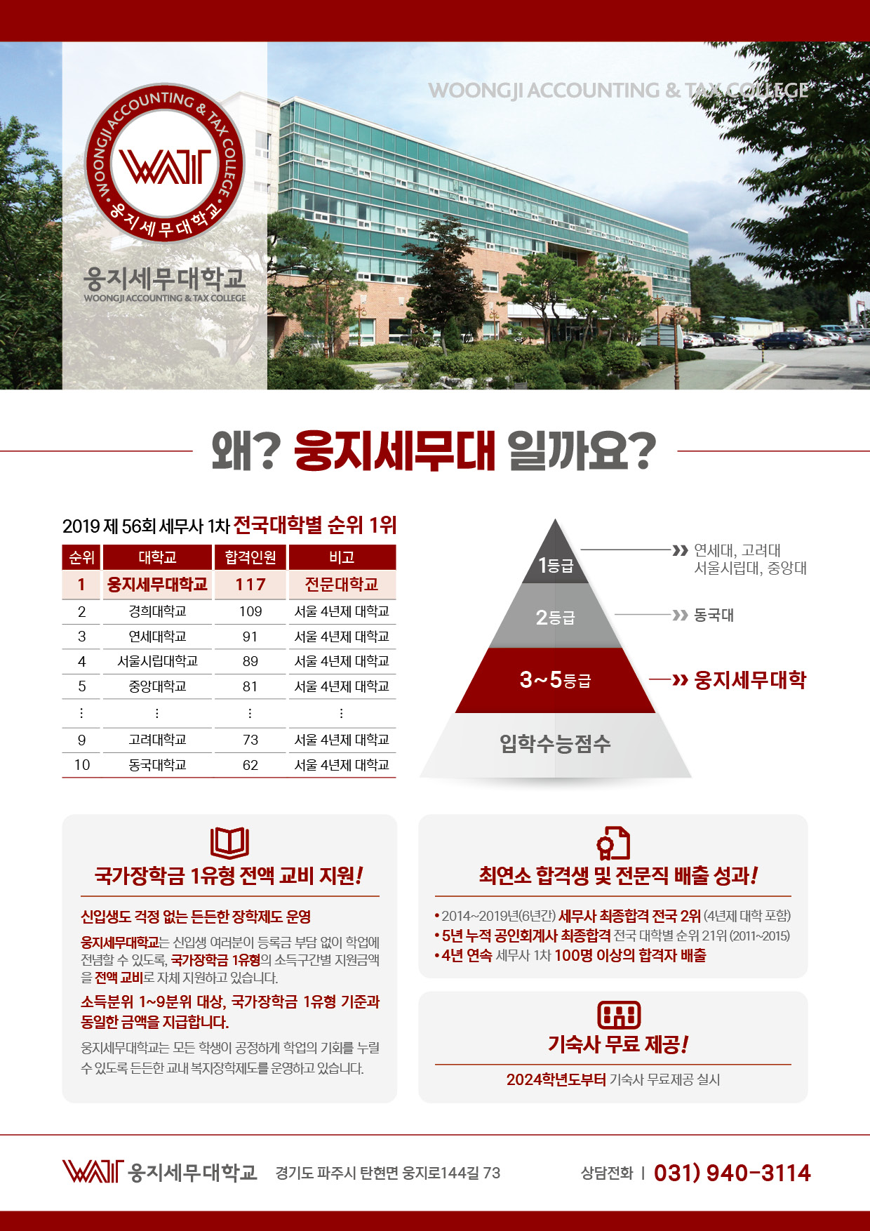 경기 파주시 탄현면 웅지로144번길 73 웅지세무대학교 입학홍보처 대표전화 : 031-940-3141 FAX : 031-940-3139