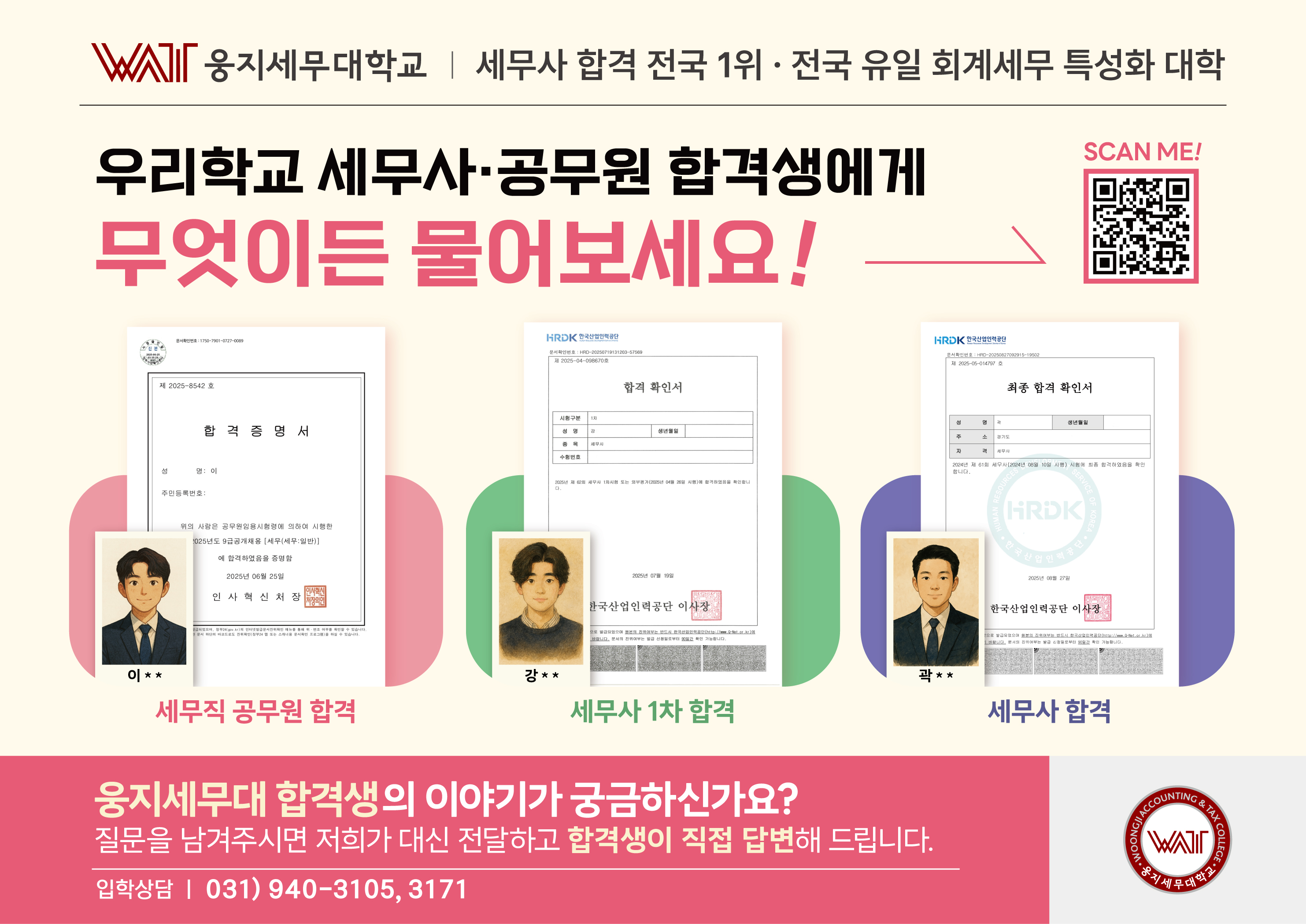 경기 파주시 탄현면 웅지로144번길 73 웅지세무대학교 입학홍보처 대표전화 : 031-940-3141 FAX : 031-940-3139