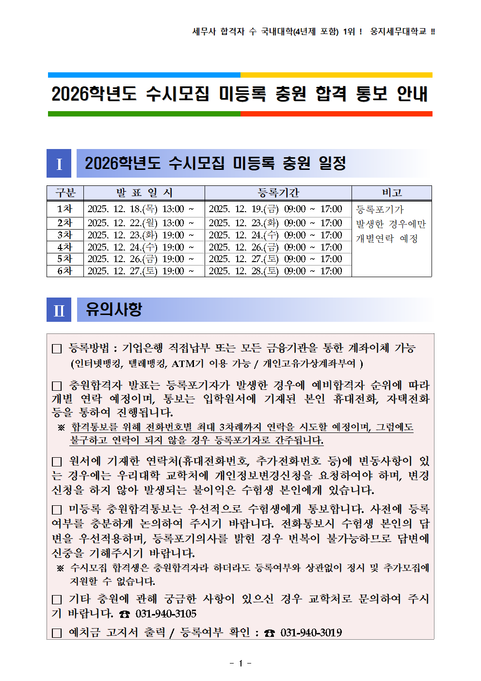 2026학년도 수시 미등록 충원 합격 통보 안내