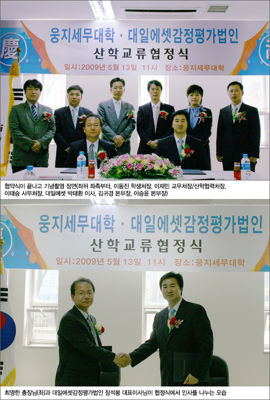 2009년 5월 13일(수) 오전 11시 우리대학에서 대일에셋감정평가법인과 산학교류협정식을 체결하였습니다.