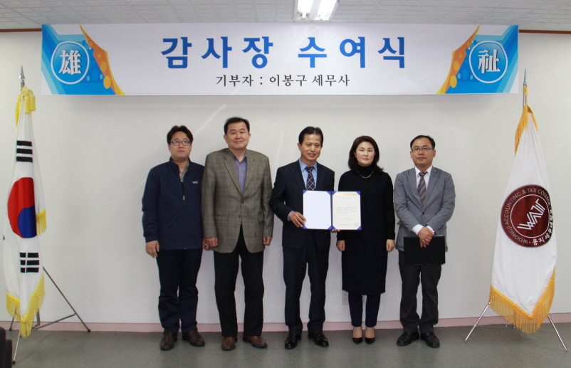 학생들의 현장실습과 고양세무서 교육으로 인연을 맺은 이봉구 세무사가 우수인재 양성과 명문대학으로의 도약을 기원하며 장학금 이천만원을 기부했다.