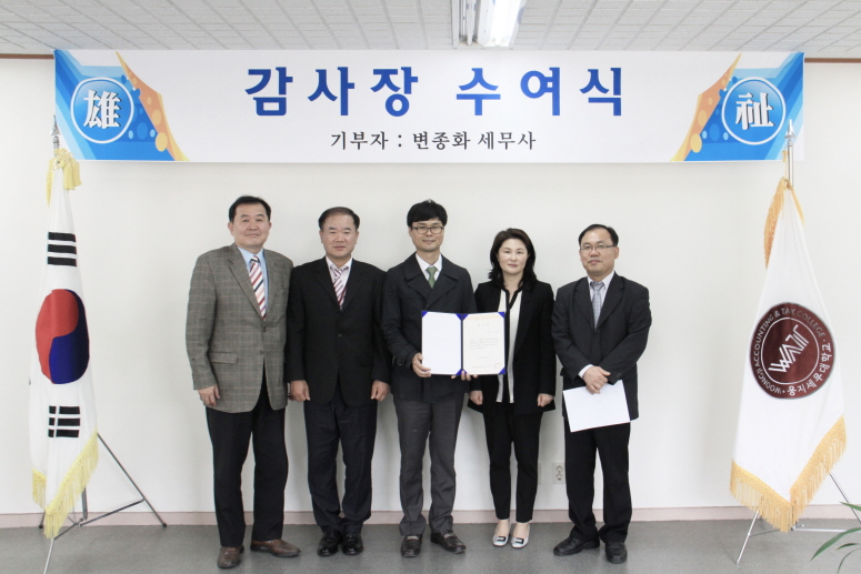이날 감사장 수여행사에서 변종화 회장은 "웅지세무대학교의 발전에 조금이나마 도움이 되길 바라는 마음에서 발전기금을 기탁한다"고 말했다.