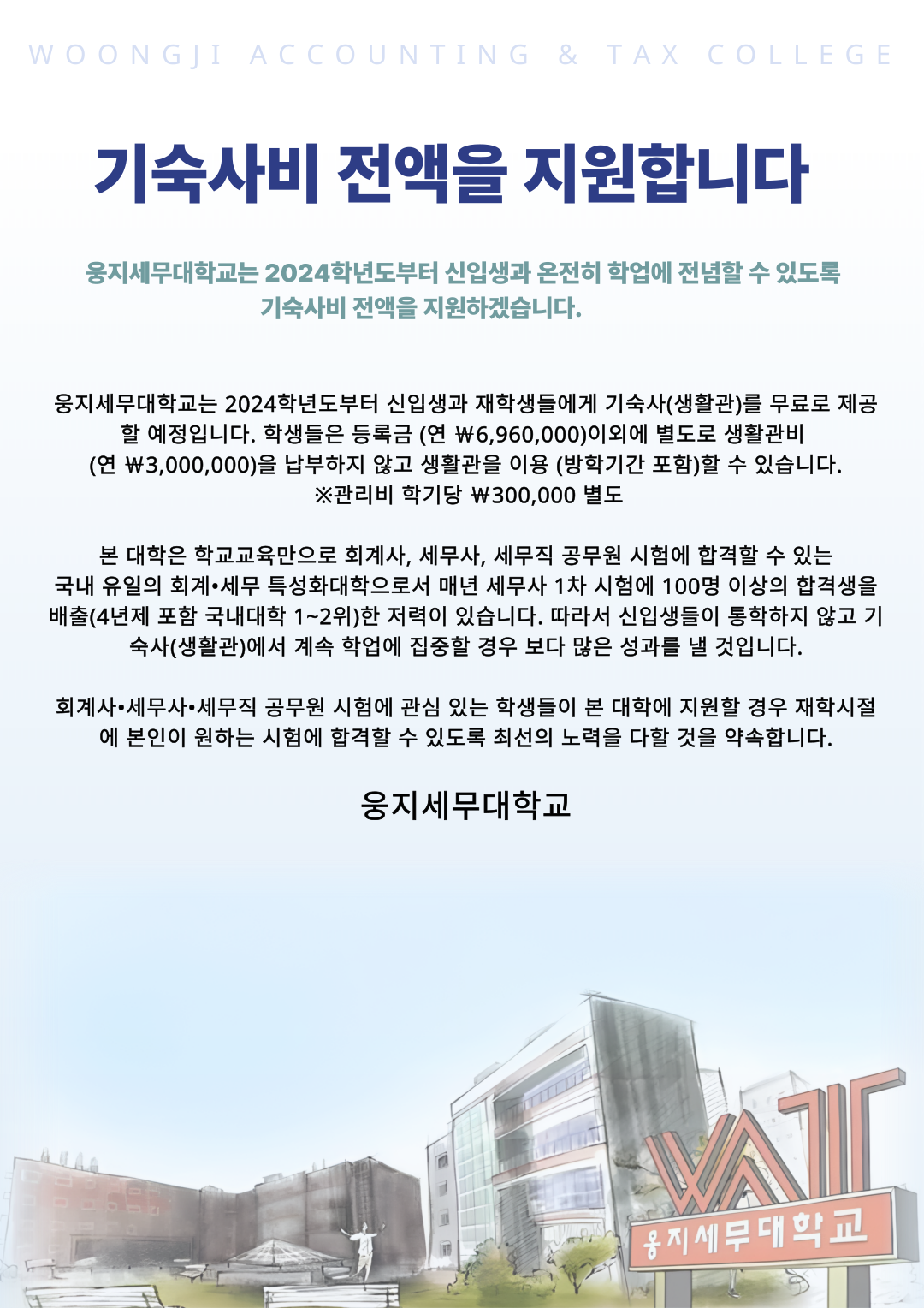 경기도 파주시 탄현면 웅지로 144번길 73 웅지세무대학교 대표전화 : 031-940-3114 FAX : 031-940-3199