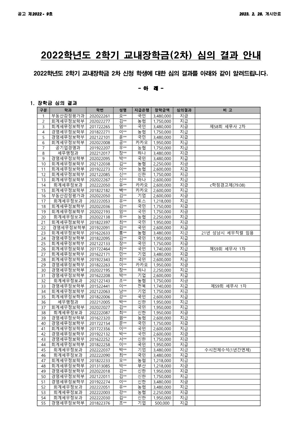 2022학년도 2학기 교내장학금(2차) 심의 결과 안내.pdf