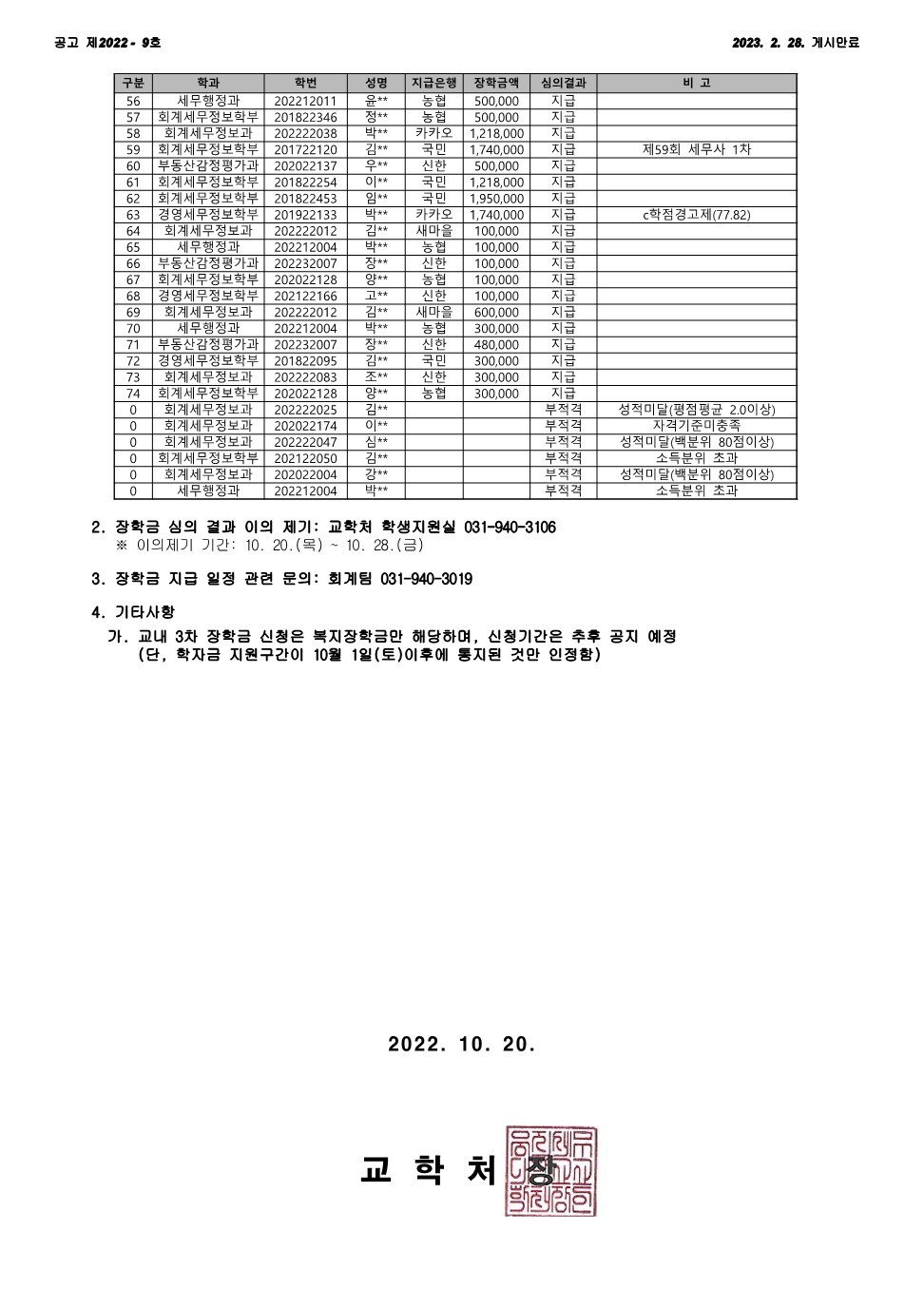 2022학년도 2학기 교내장학금(2차) 심의 결과 안내